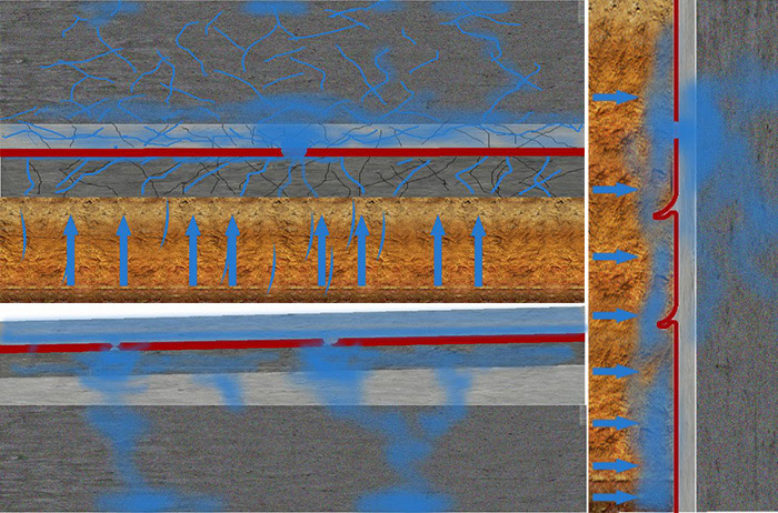 1. 底板設(shè)計缺陷:防水層與結(jié)構(gòu)底板間的保護層容易發(fā)生竄水,防水層出現(xiàn)缺陷后,滲漏水會沿著保護層間隙擴散,導(dǎo)致底板出現(xiàn)大面積滲漏水,難以根治滲漏隱患。